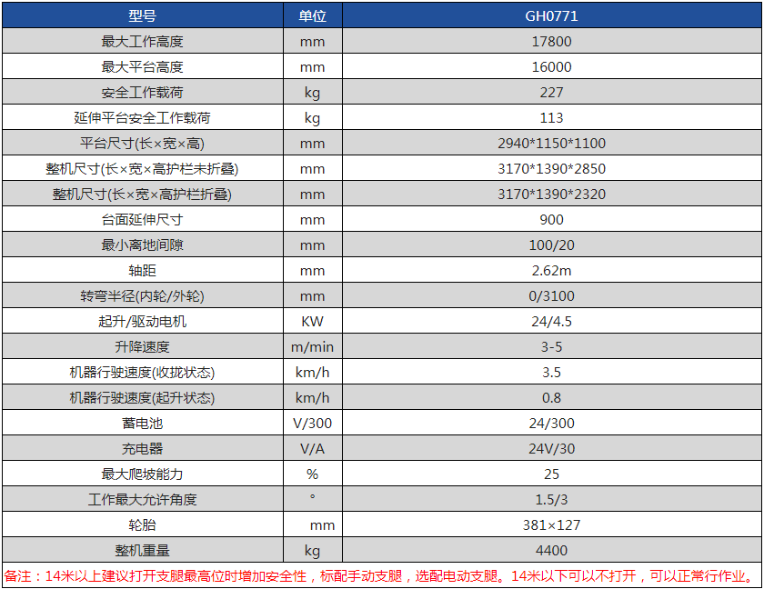 冠航特别提醒:14米以上建议打开支腿最高位时增加安全性,标配手动支腿,选配电动支腿。14米以下可以不打开,可以正常行作业。
