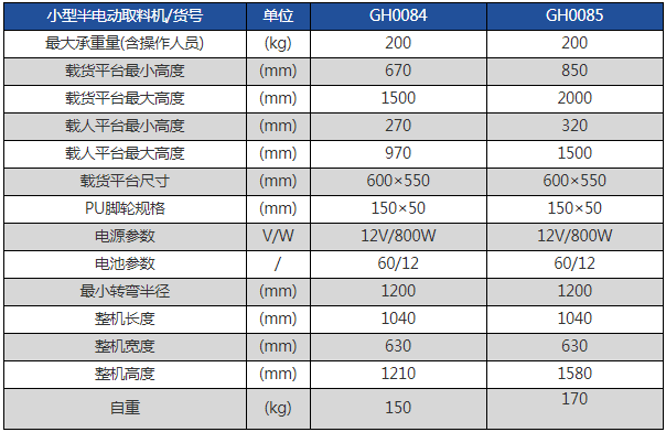 小型半电动取料机额定载重:200kg最高高度:670-1500mm采用电池组快速升高至理想高度;手推装置灵敏性能更佳;减少变形,在应用场所内可提高安全性和工作效率;整车采用优