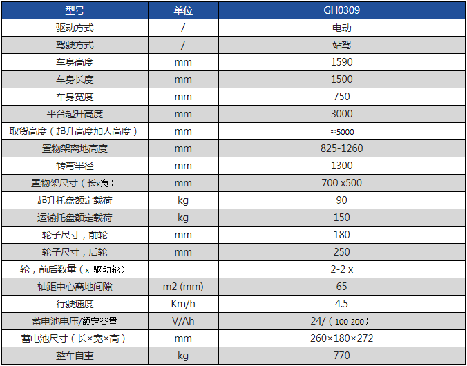 全电动工作辅助车额定载重:90kg最高高度:3000mm采用双驱差速转弯,转弯半径1300;采用双安全保护措施,当人体脚伸出车体,车辆将不可行走,避免货架与车体夹伤操作人员。当